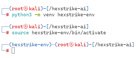 然后執(zhí)行如下命令,創(chuàng)建一個(gè)python虛擬環(huán)境并激活,hexstrike MCPs Server會(huì)運(yùn)行在這個(gè)虛擬環(huán)境中