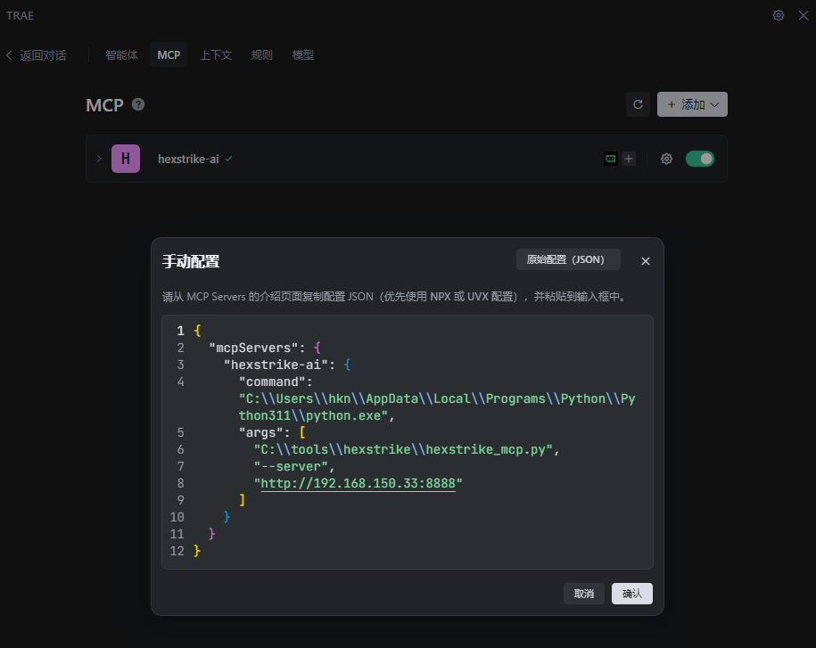 然后開(kāi)始配置工具,主要就是配置命令這一項(xiàng),需要配置客戶端python的絕對(duì)路徑、hexstrike_mcp.py的絕對(duì)路徑以及上述MCP服務(wù)端地址,具體命令示例如下