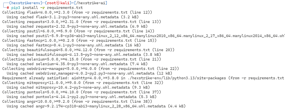 安裝hexstrike MCPs Server所需要的依賴,安裝過(guò)程中可能會(huì)因?yàn)榫W(wǎng)絡(luò)問(wèn)題或依賴版本問(wèn)題出現(xiàn)報(bào)錯(cuò),按照?qǐng)?bào)錯(cuò)提示解決即可